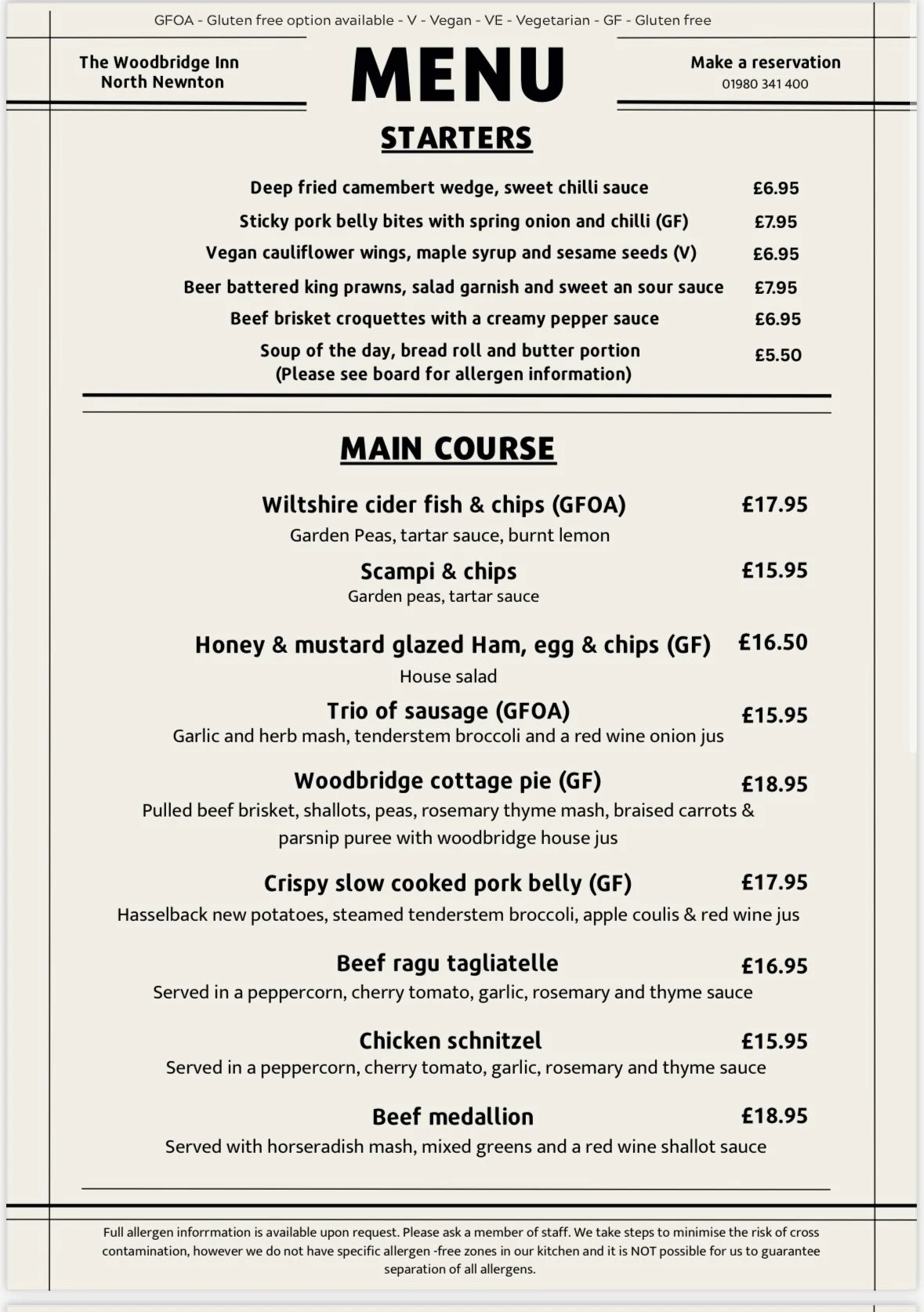 Our menu celebrates classic pub favourites with a touch of countryside charm. From hearty mains like Wiltshire cider fish & chips and traditional Sunday roasts to vibrant salads, comforting pies, and stacked burgers, there's something for every appetite. We proudly serve local ales, hand-prepared dishes, and a warm welcome — whether you're here for a quiet lunch or a lively evening. Vegetarian and vegan options available.